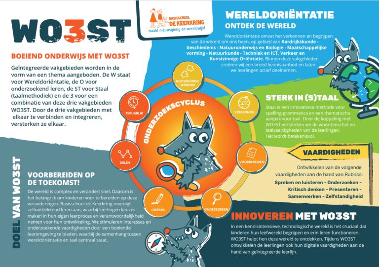 Het vak WO3ST staat voor WereldOriëntatie, onderzoekend leren (3) en STaal. In de ochtend gebruiken we de methode Staal voor taal- en spellingonderwijs. De middagen staan in het teken van wereldoriëntatie. De thema’s van Staal zijn leidend. De vakken mens & maatschappij, aardrijkskunde, natuur, geschiedenis, techniek en digitale vaardigheden zijn met deze thema’s verwerkt in een leerlijn. In deze leerlijn werken de leerlingen aan vaardigheden en kennisdoelen. De inhoud is afgestemd op de kerndoelen van het SLO. Om een onderzoekende houding te stimuleren volgen we de stappen van de cyclus van onderzoekend leren. Hiervoor hebben we een stappenplan samengesteld dat elk thema wordt doorlopen.